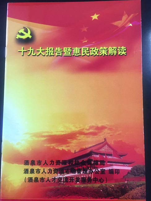 11月28日,市人社局副局长、市人力资源市场管理办(人才中心)主任苗旗新同志代表人社局党组,带领部分帮扶干部深入精准扶贫联系帮扶点—瓜州县广至乡洮砚村,通过发放专门印制的《十九大报告暨惠民政策解读》宣传册,向帮扶群众宣传党的十九大精神,与群众畅谈十九大精神学习体会,并结合人社业务工作,向广大群众解读了相关惠民政策,切实将党的十九大精神送到了群众心坎上,让十九大精神家喻户晓、入脑入心,为深入学习宣传贯彻党的十九大精神,以习近平新时代中国特色社会主义思想为指引,认真落实党的十九大关于脱贫攻坚的安排部署,坚决打赢脱贫攻坚战提供了强大的精神动力。